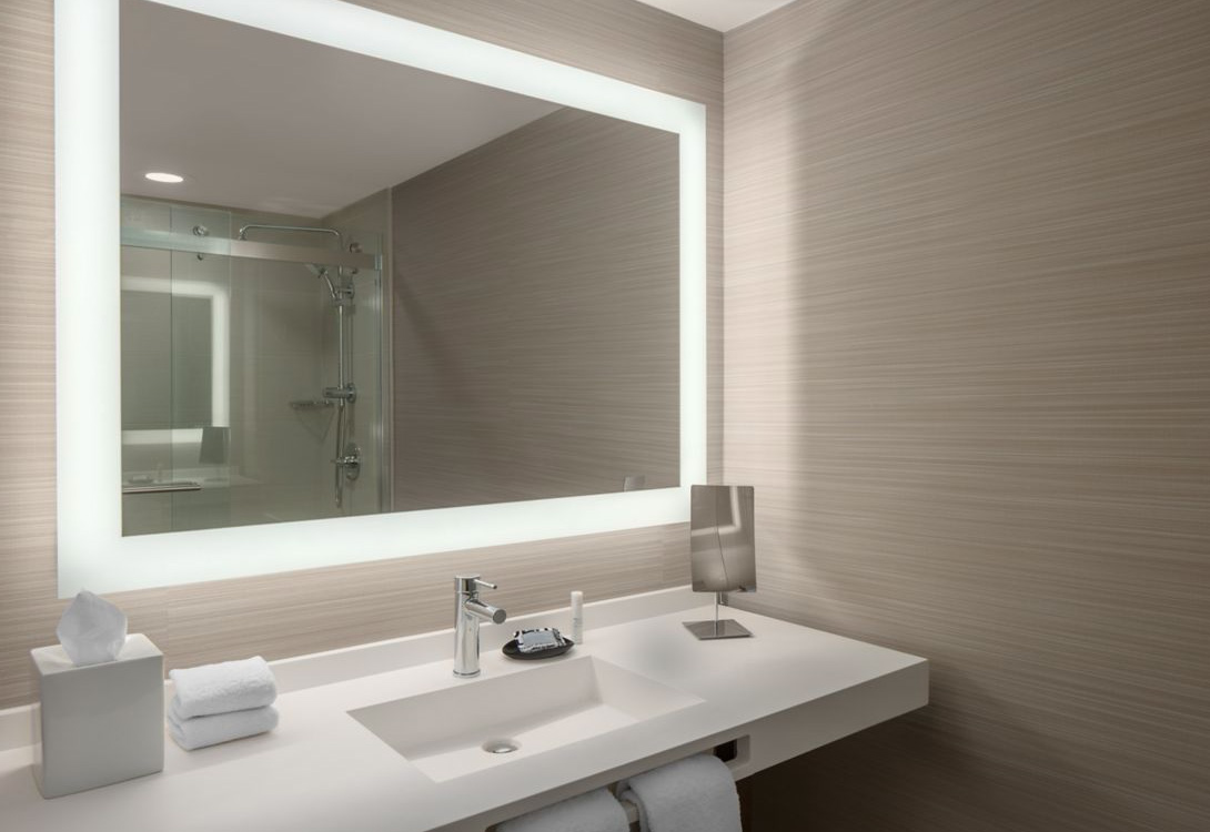 The guest rooms renovation included: updated tile flooring and carpet, new wallcovering, paint, new bathroom vanities / countertops / mirrors and full tub replacements to showers including glass barn door style shower doors.